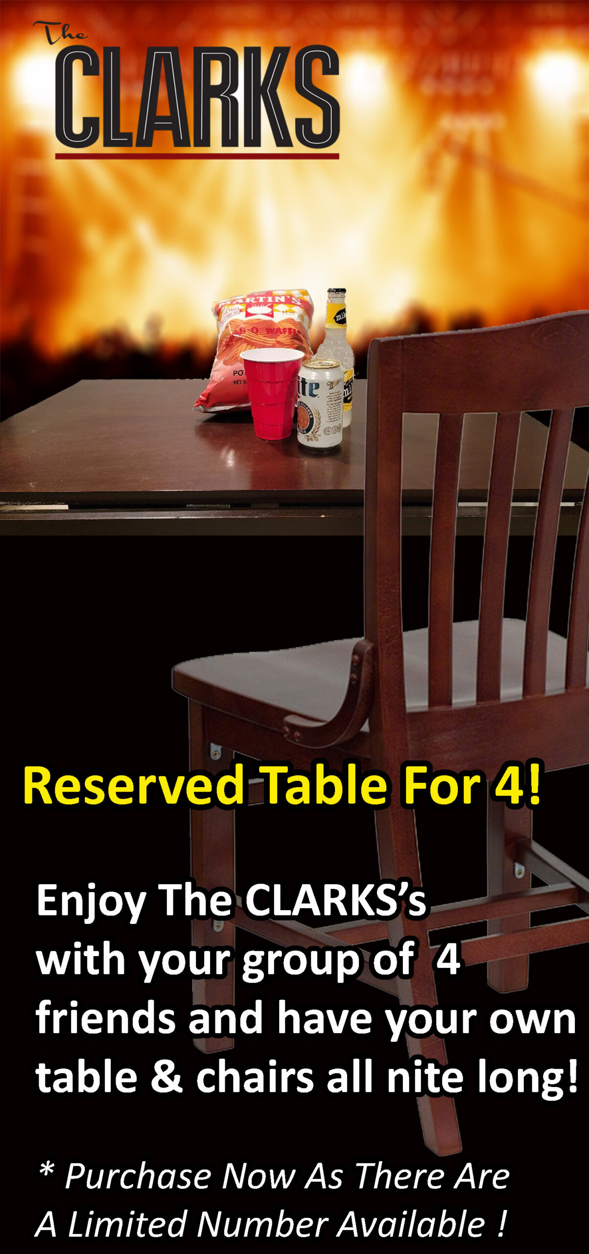 Reserved “Hi-Top” Table & Chairs For (4) With Food Platter & Parking Pass !